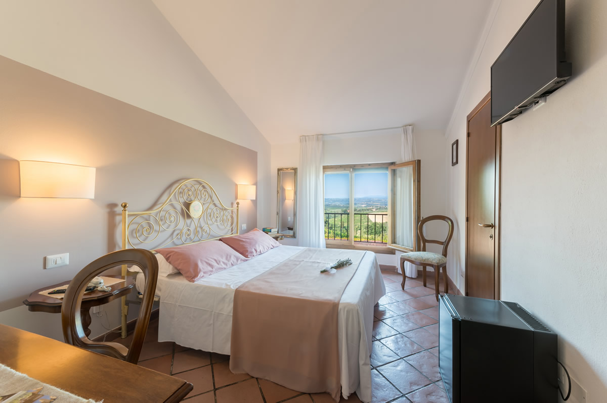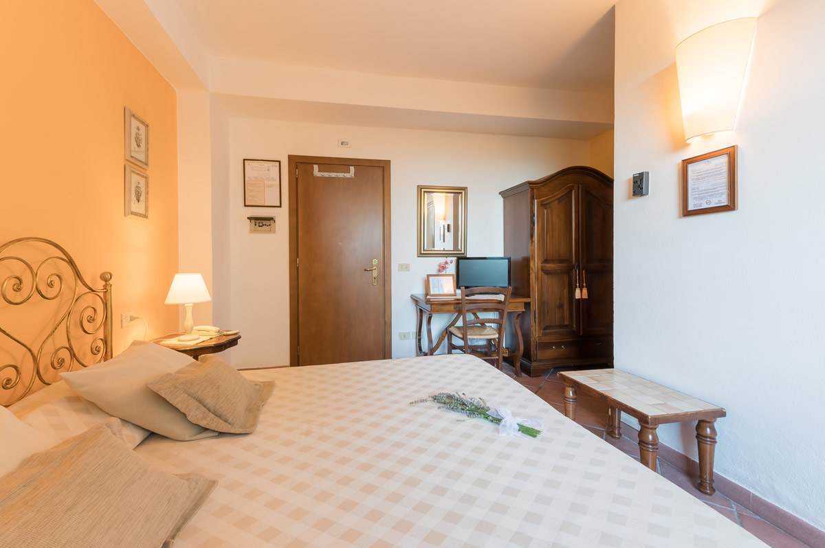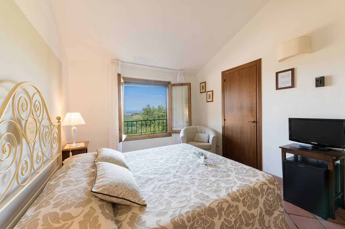 Camera con vista panoramica sulle colline toscane, dotata di tutti i comfort per un soggiorno piacevole: TV Smart da 32 pollici, aria condizionata, Wi-Fi, bagno privato con doccia e asciugacapelli, cassaforte e frigorifero. Un ambiente accogliente e funzionale, ideale per godersi relax e tranquillità immersi nella splendida cornice della Toscana.