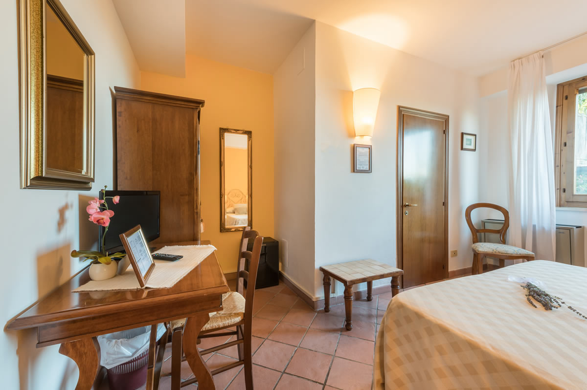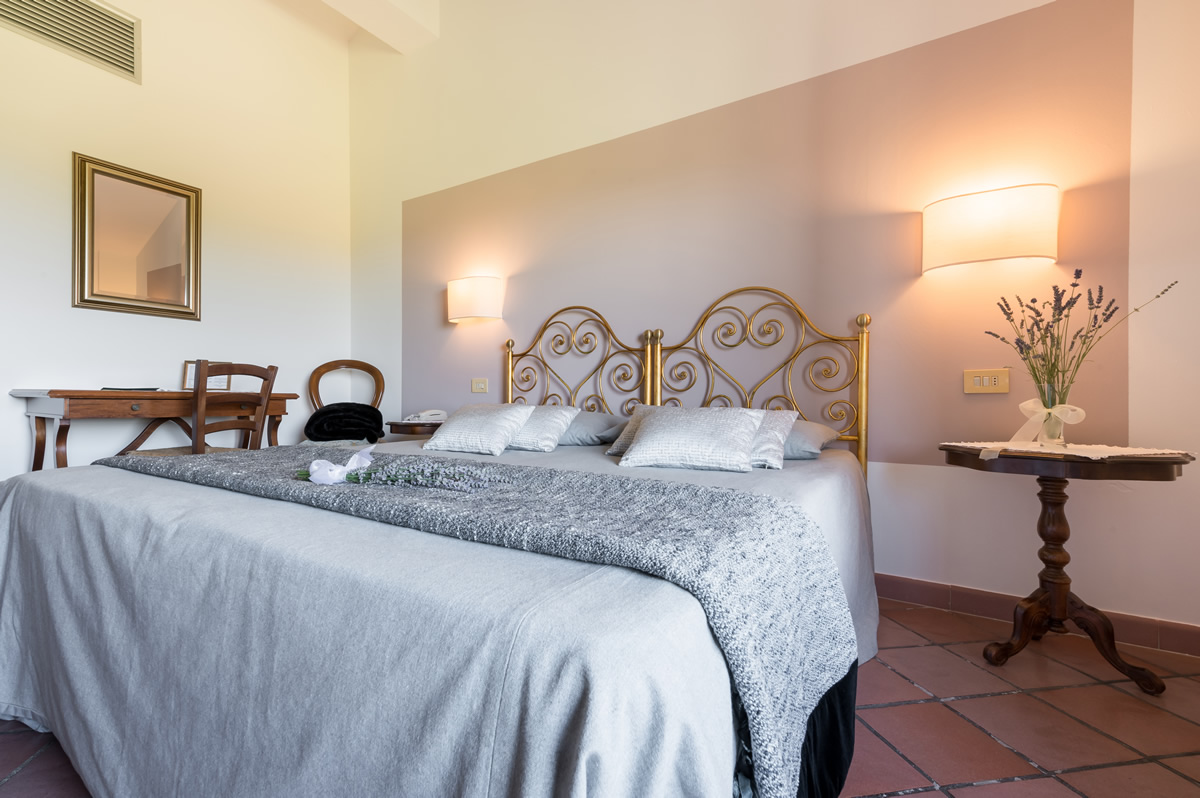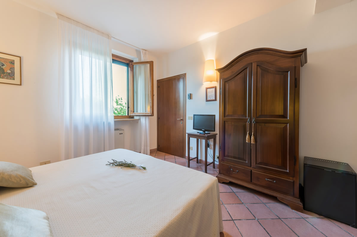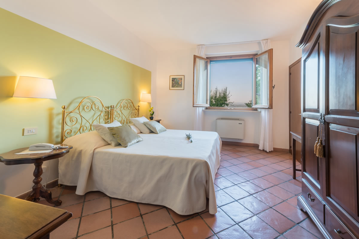 Camera con vista panoramica sulle colline toscane, dotata di tutti i comfort per un soggiorno piacevole: TV Smart da 32 pollici, aria condizionata, Wi-Fi, bagno privato con doccia e asciugacapelli, cassaforte e frigorifero. Un ambiente accogliente e funzionale, ideale per godersi relax e tranquillità immersi nella splendida cornice della Toscana.